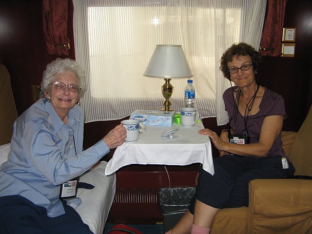 On train, Bernice Noll visits Judith for tea. Cabin attendant Susan (not shown)
