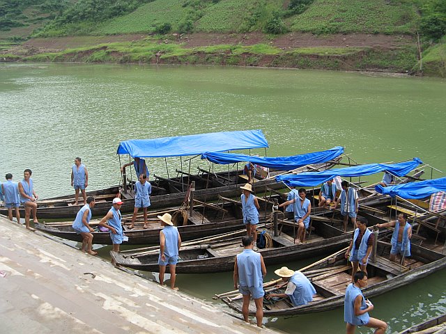 Boat pullers on the Yangtzi in the wooden sampan boats, also called pea boats